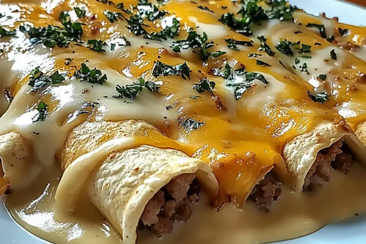 Pour the rich sausage gravy over the assembled enchiladas, ensuring they are generously covered. Cover the baking dish with aluminum foil and place it in the preheated oven to bake for 25 minutes. Afterward, remove the foil and bake uncovered for an additional 10 minutes until the enchiladas are bubbly and the tops are golden brown.