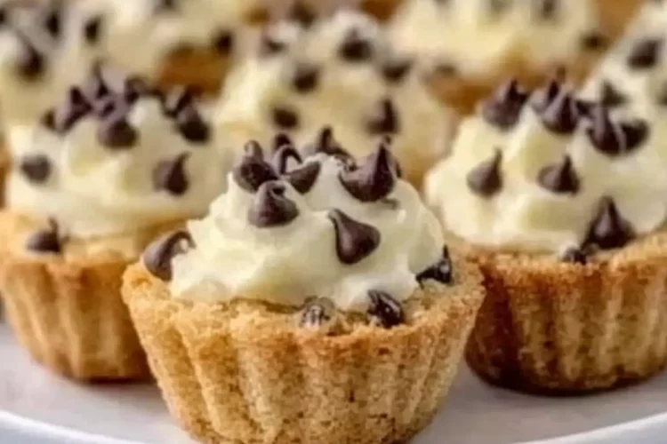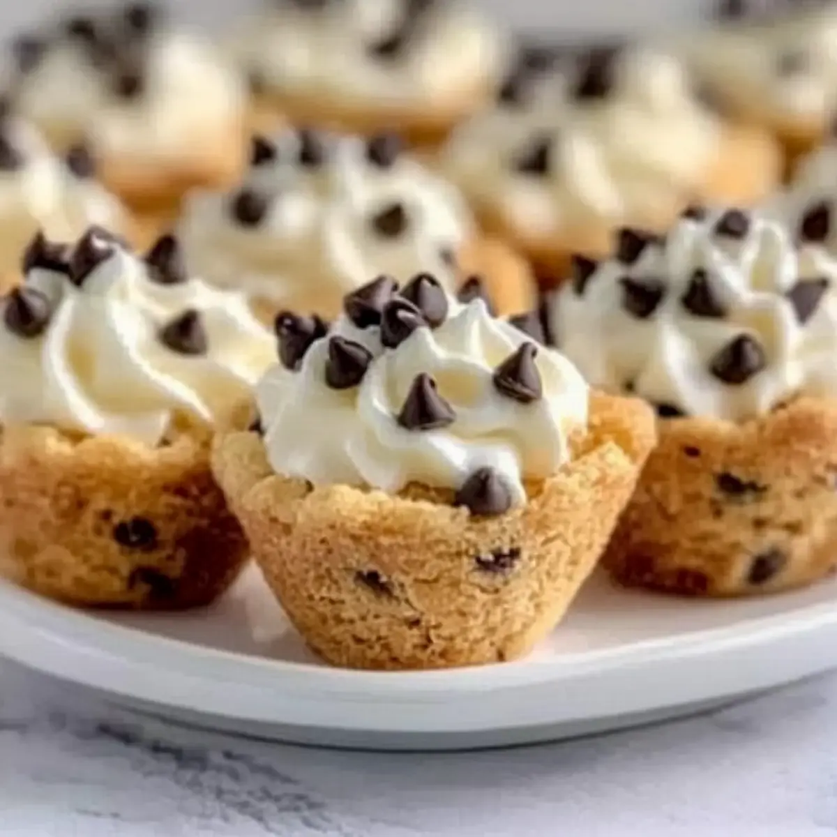 Once the cookie cups have cooled completely and the filling has chilled, carefully scoop the ricotta mixture into each cup using a piping bag or a spoon. Fill them generously, allowing a little to overflow, and make it fun! Top each filled cup with additional mini chocolate chips for a sweet finish.
