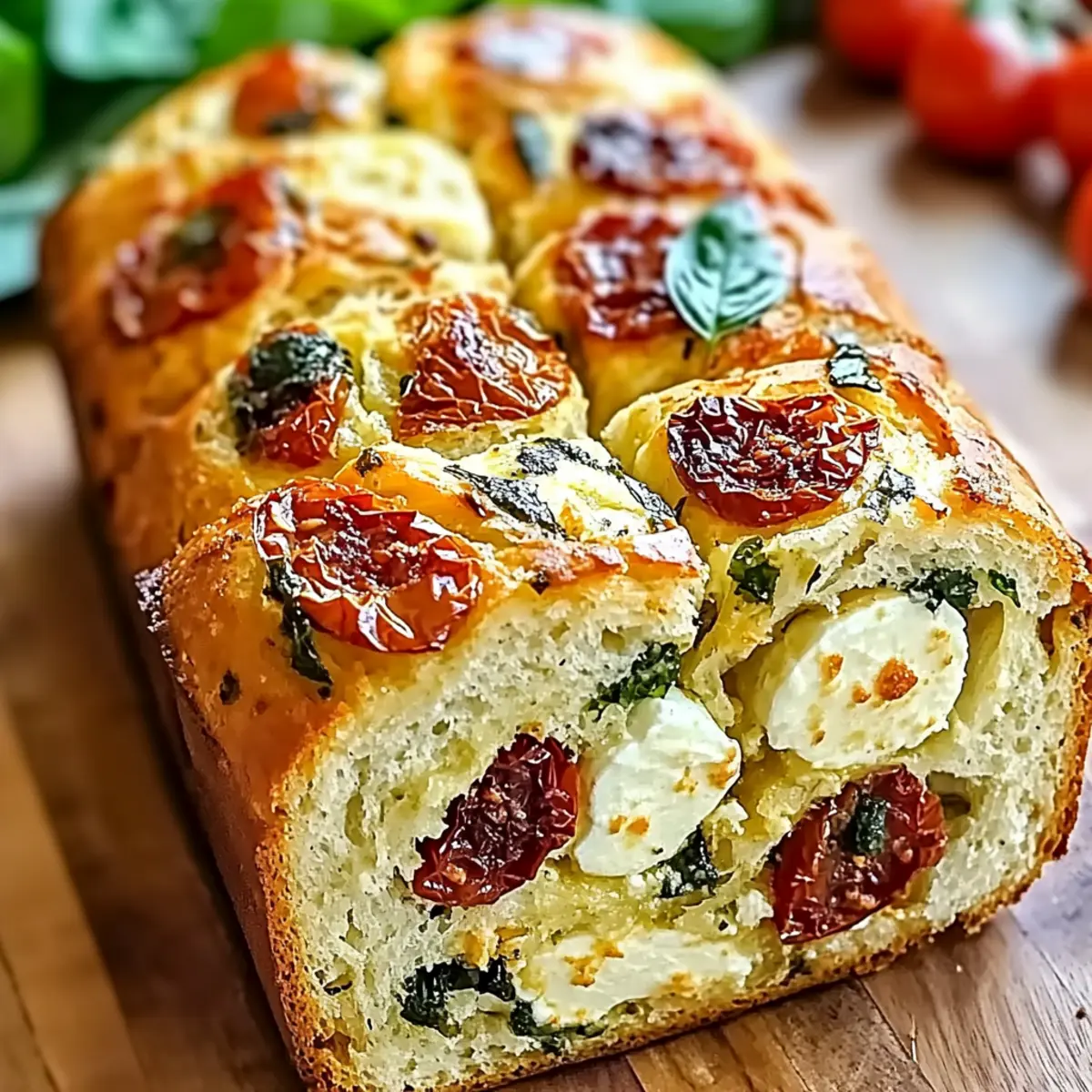 Flavorful Burst: Each bite of this Caprese Loaf Bread explodes with the flavors of creamy mozzarella and tangy sun-dried tomatoes, perfectly complemented by aromatic fresh basil.