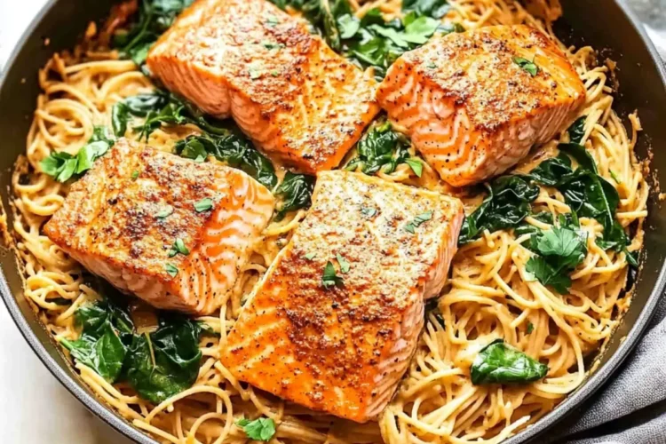 Crispy Green Salad: A fresh salad with mixed greens, cherry tomatoes, and a tangy vinaigrette balances the creamy pasta. The crunchiness contrasts beautifully with the tender salmon and pasta.