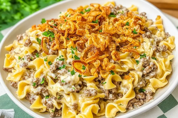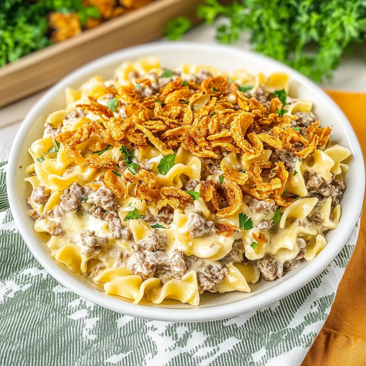 Definitely! If you or someone in your family has dietary restrictions, consider using ground turkey or chicken for a leaner alternative. You can also swap regular egg noodles for gluten-free pasta if needed. Always check labels for allergens if you’re serving others, especially with the cream of mushroom soup and French onion dip!
