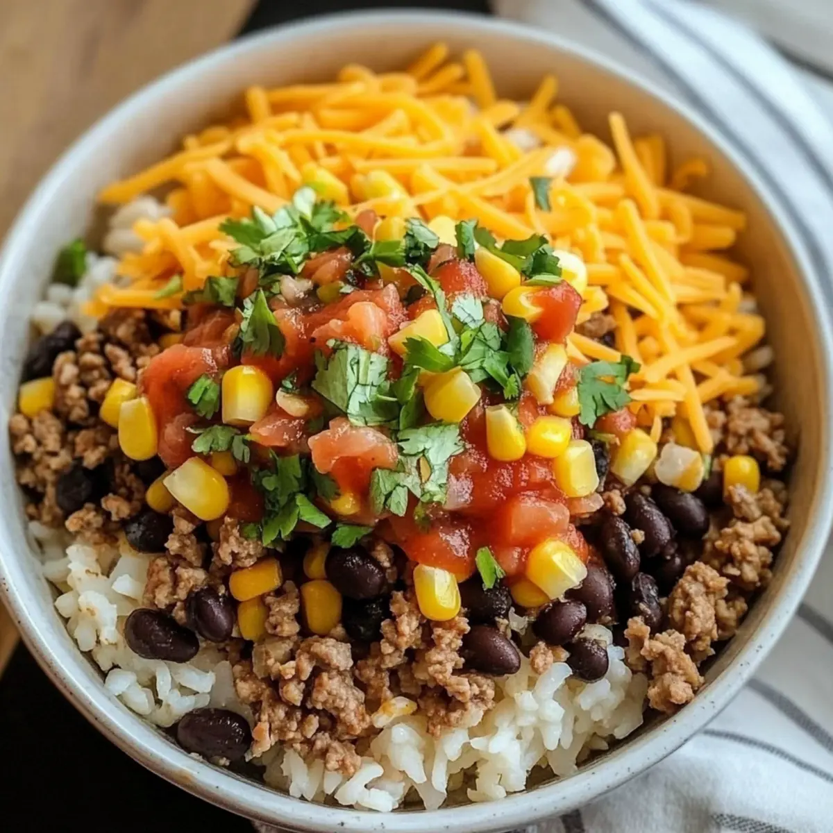 To create your Ground Beef Burrito Bowl, start with a generous scoop of hot rice in each serving bowl. Next, add 1/2 cup of your seasoned ground beef, followed by 1/4 cup each of black beans and corn. Top it off with 1/4 cup of freshly grated cheddar cheese, 2 tablespoons of salsa, and 1 tablespoon of chopped cilantro for freshness.