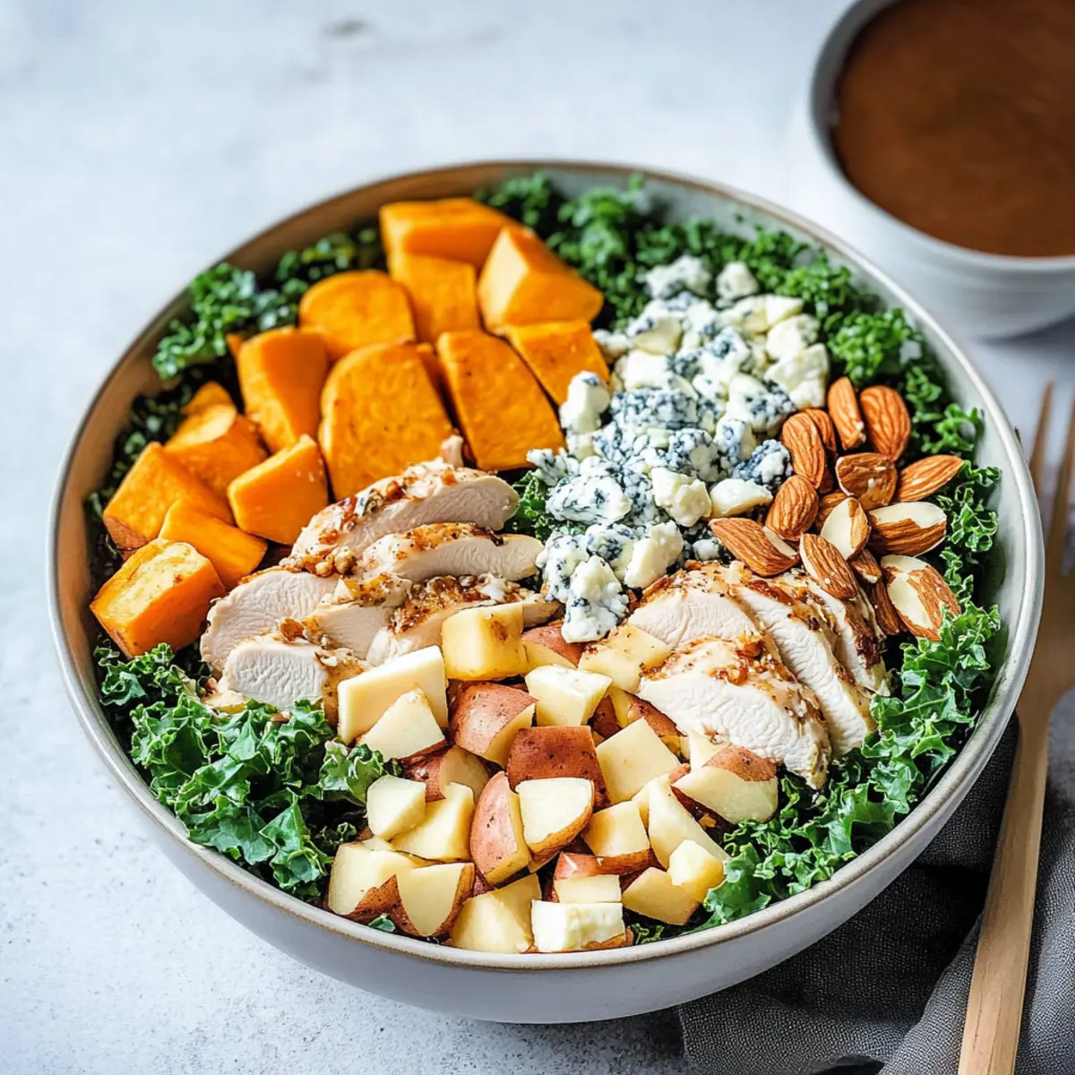 - Assemble the salad by layering kale, chicken, sweet potatoes, apples, blue cheese, and almonds in meal prep containers.