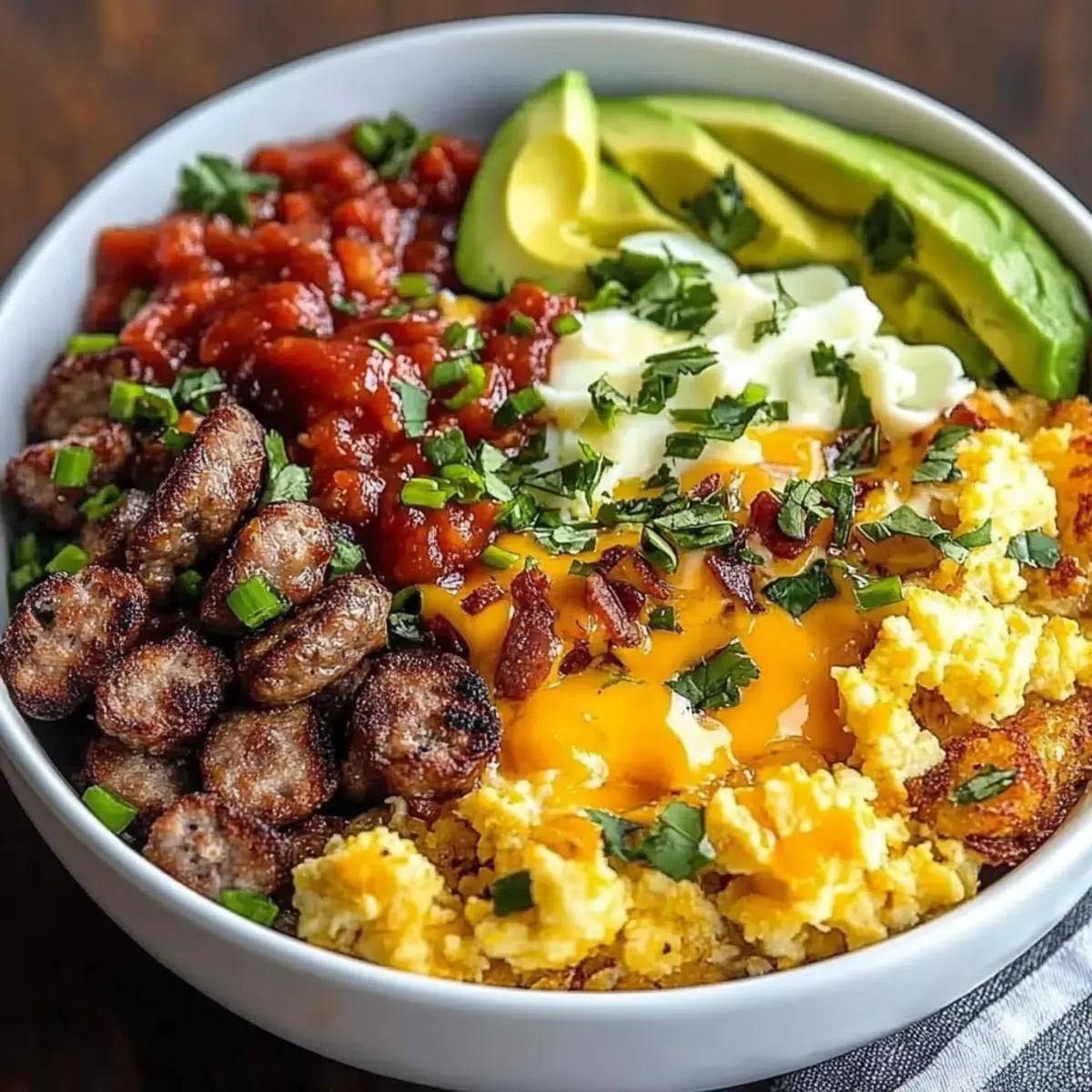 Now it’s time to build your delicious Hash Brown Breakfast Bowls! Divide the crispy hash browns equally into serving bowls. Top each bowl with a generous portion of the fluffy scrambled eggs, followed by the cooked sausage. Sprinkle with shredded cheddar cheese, allowing it to melt slightly, and then add salsa and sliced avocado on top, garnishing with green onions and cilantro if desired.