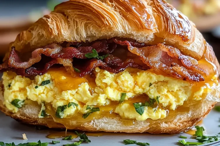 Enjoy the indulgent flavors of a Maple Mustard Croissant Sandwich, combining flaky croissants, savory bacon, and a unique sauce for a tasty breakfast.