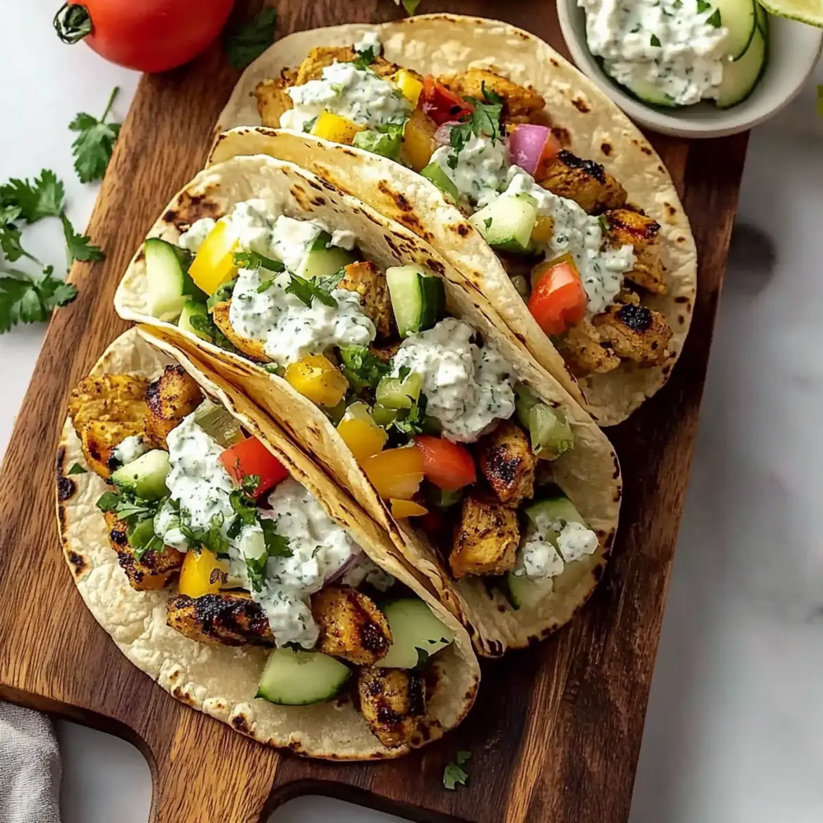 - Assemble the tacos with chicken, fresh salsa, and tzatziki.