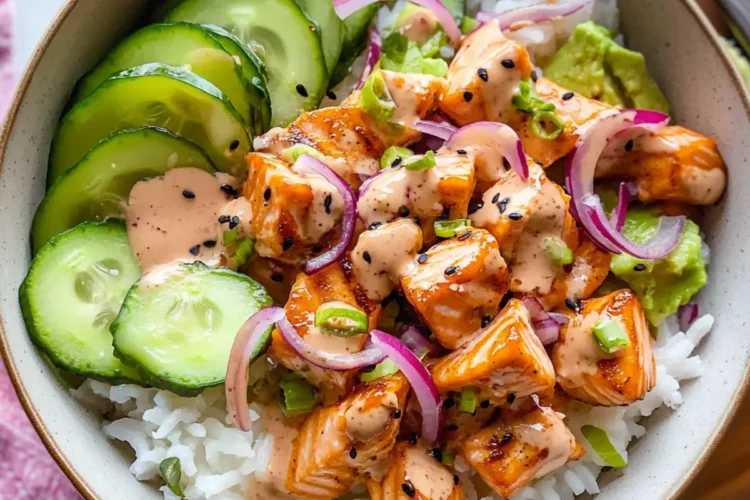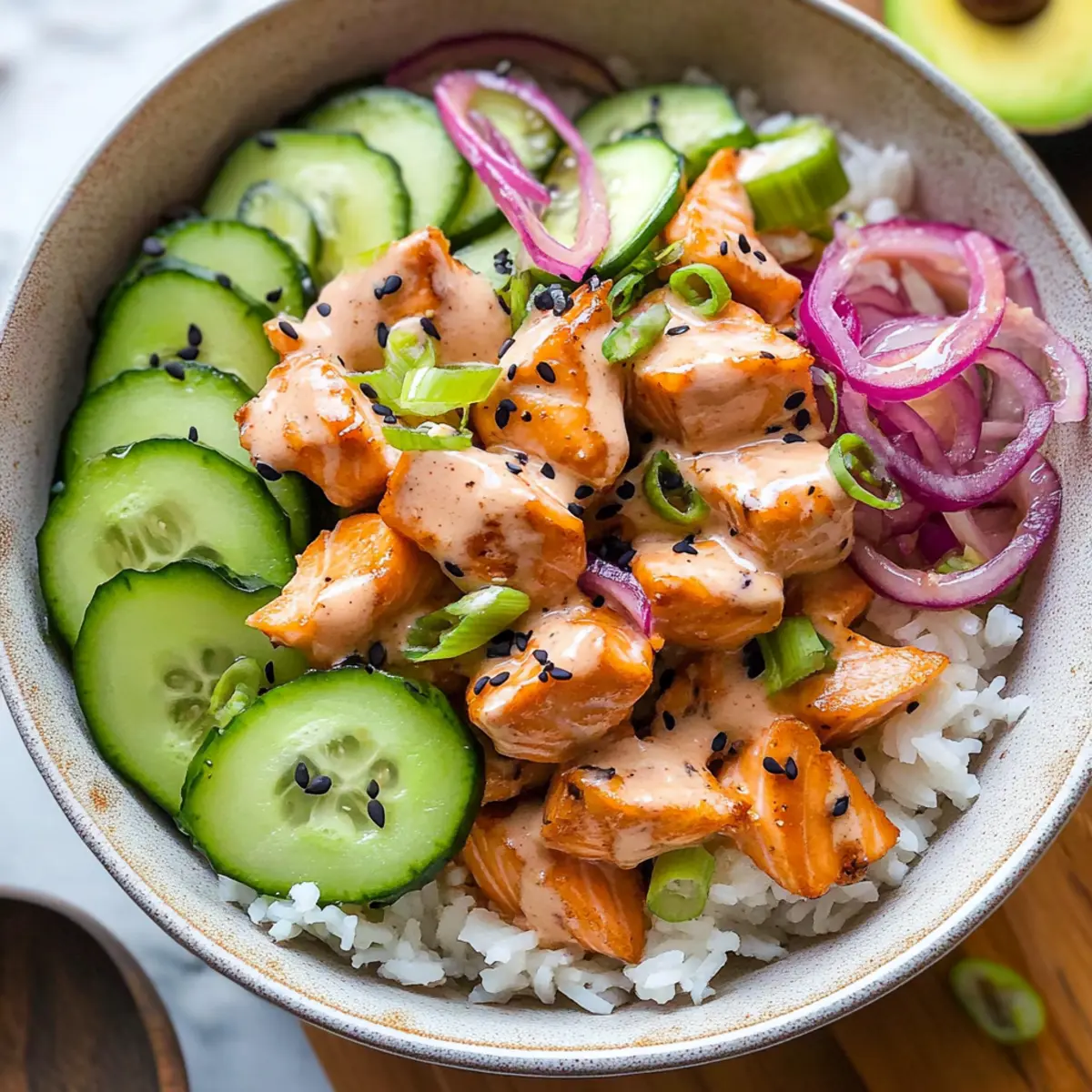 - Assemble the bowls with a base of cooked rice, topped with salmon, cucumber, avocado, and pickled red onions.