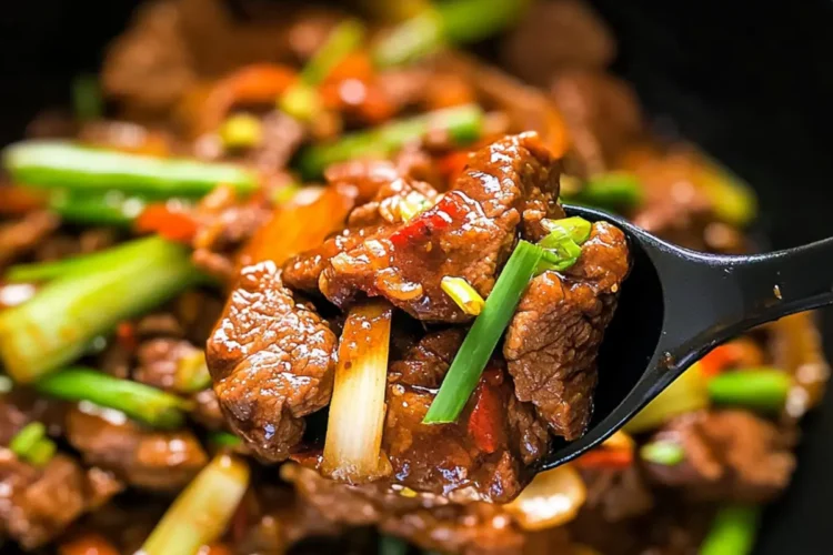 4. In a wok, heat 1 tablespoon of oil over medium-high heat until shimmering. Add the marinated beef slices and cook for about 1 minute per side, or until browned and just cooked through.