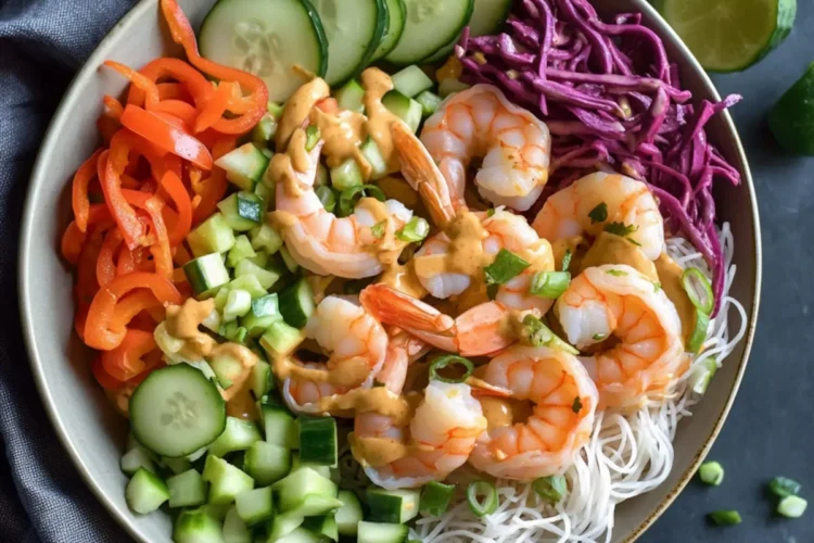 Enjoy vibrant Spring Roll Bowls filled with fresh vegetables and shrimp, topped with a creamy peanut dressing.