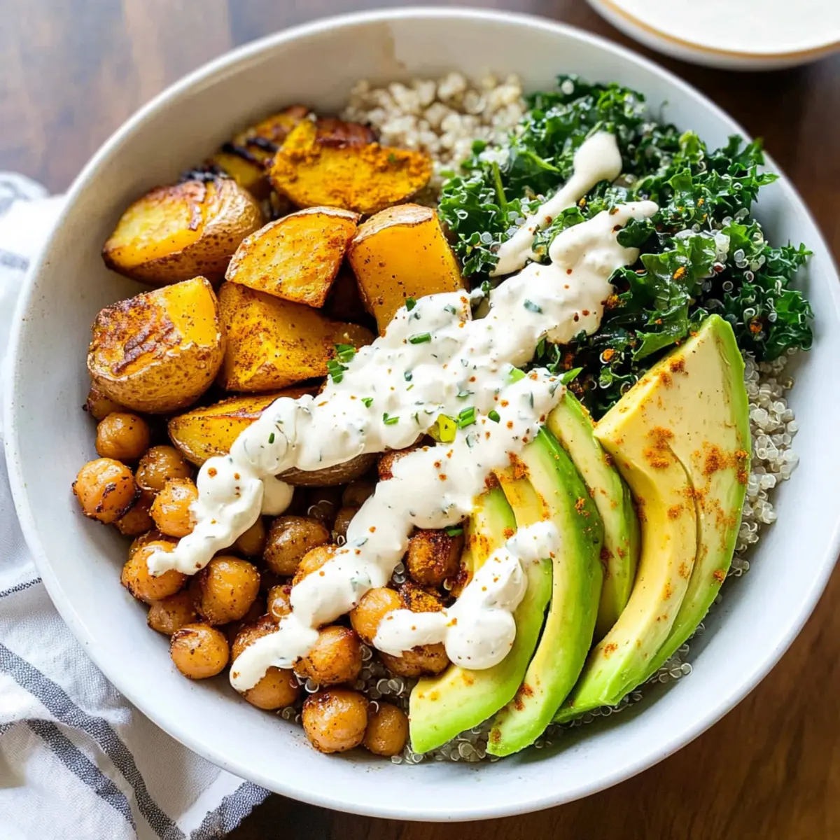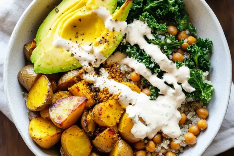 - Assemble bowls with quinoa, kale, roasted potatoes, chickpeas, sliced avocado, and tahini dressing.